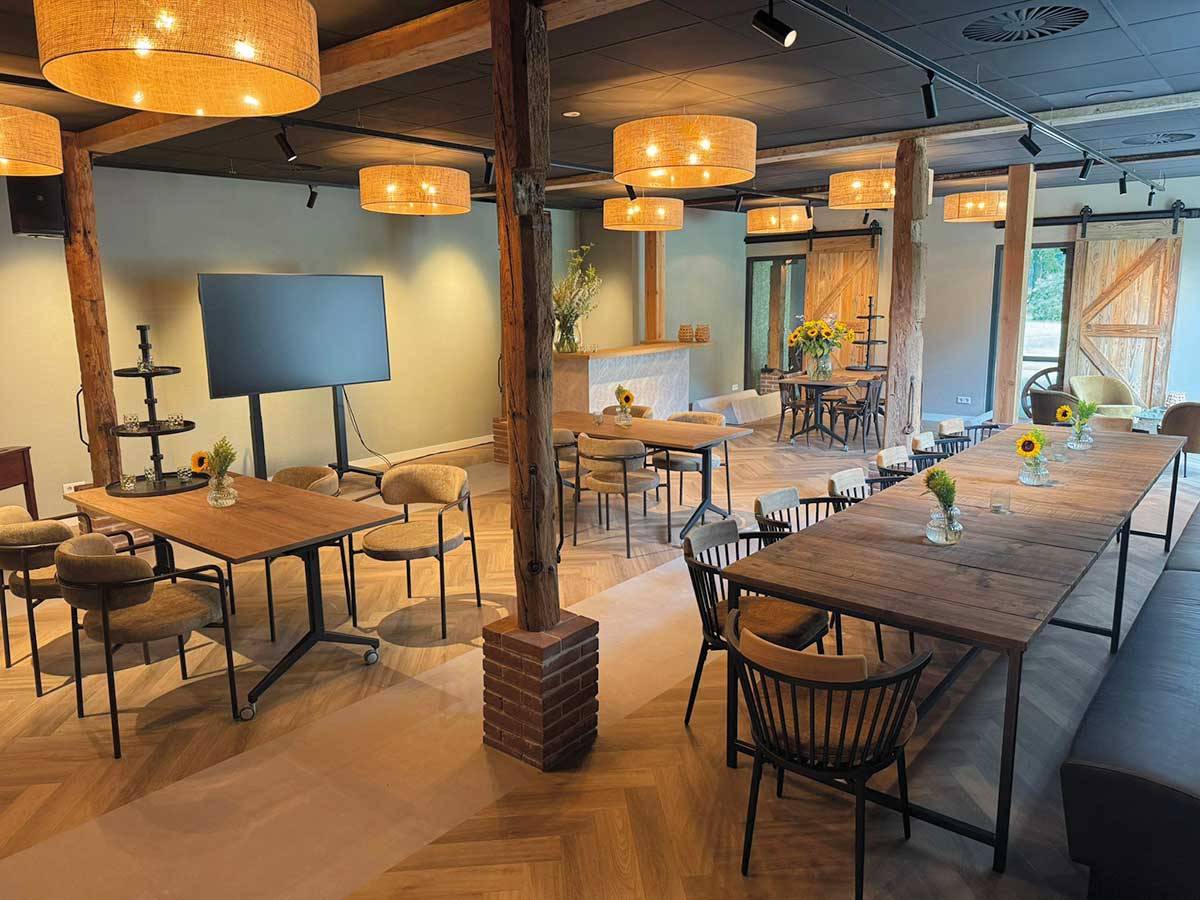 De Boerderij is vernieuwd tot een stijlvolle locatie met karakter. Binnen vind je warme, sfeervolle ruimtes voor overleg, creatie en culinaire beleving. Buiten nodigt het erf uit tot workshops, proeverijen en avonden die blijven hangen.